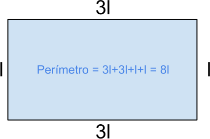 Ver solución | Si nos fijamos en el dibujo veremos que si el lado corto lo llamamos L, entonces todo el perímetro mide 3xL+3xL+L+L = 8xL